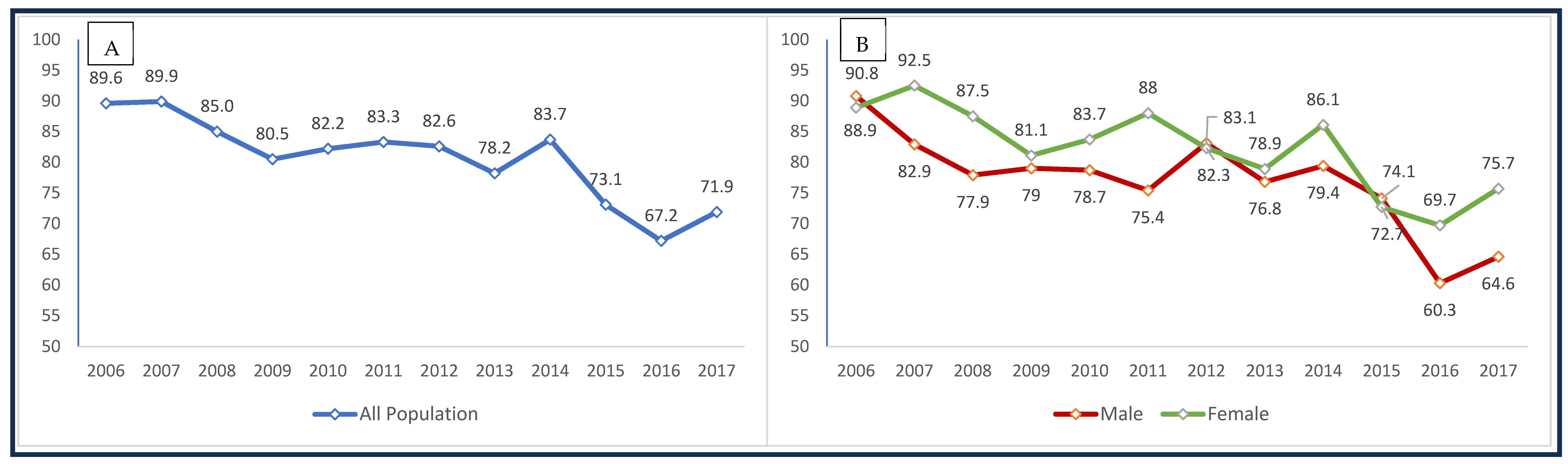 Female | 0.74 (0.64–0.86) | 0.64 (0.54–0.75) |