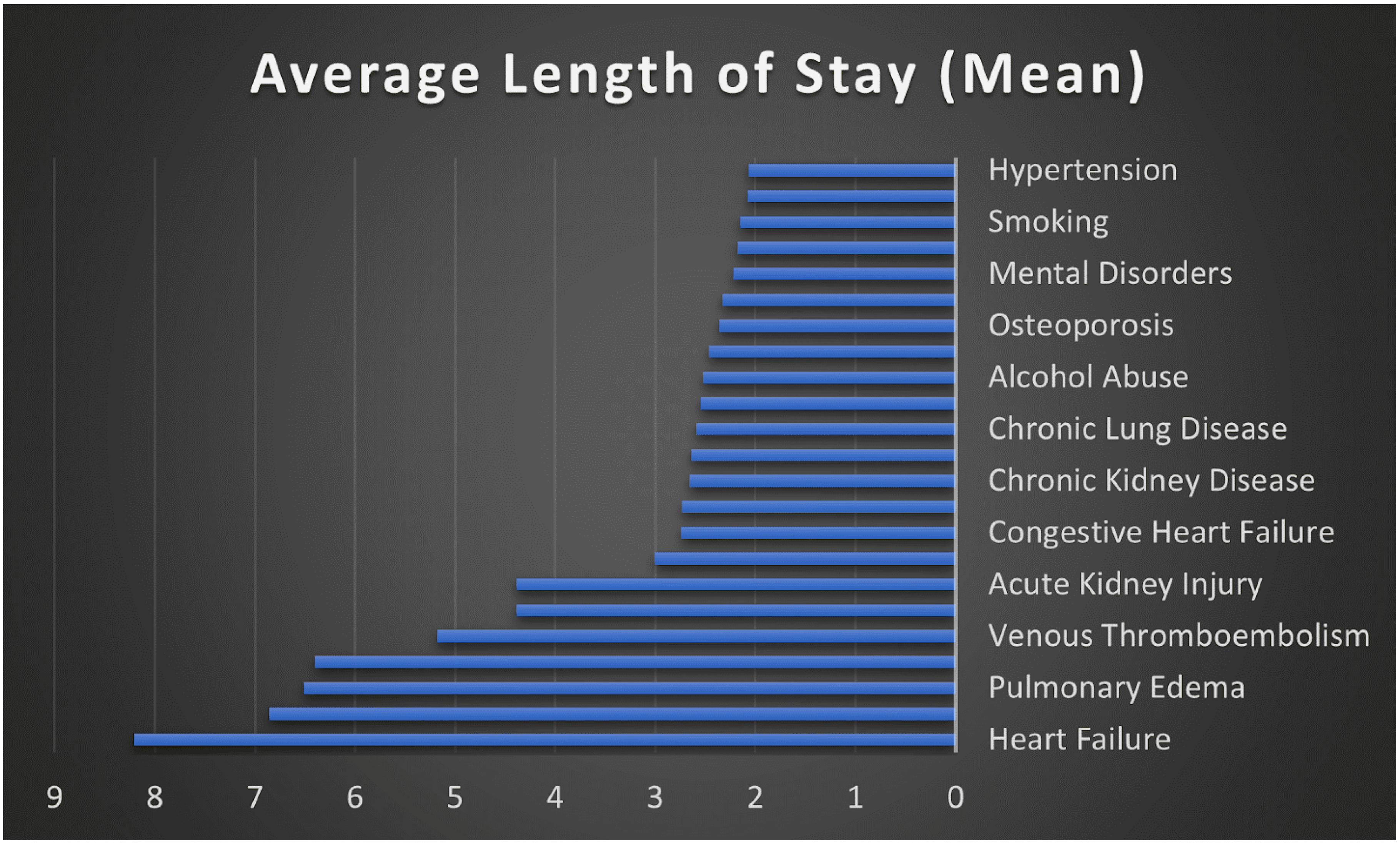 Figure 3 elucidates the statistically significant relationship between various comorbidities and complications and the average length of stay in days for patients undergoing elective THA. Notably, conditions such as acute renal failure and heart failure markedly increased the length of stay to 4.39 and 8.21 days, respectively. Similarly, acute complications like pulmonary embolism resulted in an average stay of 6.86 days.