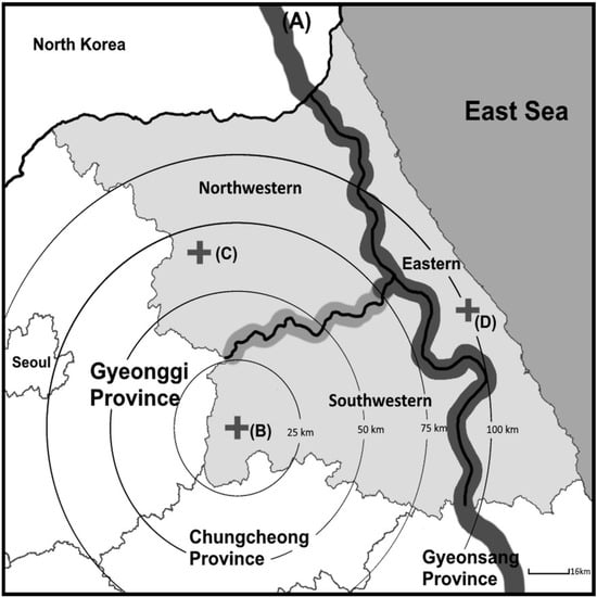 Map of Gangwon Province. (A) Main mountain range of Korea. The average height is 1248 m, and it is a boundary dividing eastern Gangwon from western Gangwon. (B) Regional trauma center in Gangwon. (C,D) Regional medical centers in northwestern and eastern regions.