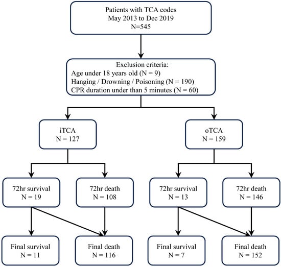 We conducted a single-institution retrospective review of the medical records of patients with TCA who were admitted to Wonju Severance Christian Hospital, an RTC in Gangwon, between May 2013 and December 2019. Among 545 patients with TCA, those aged < 18 years (N = 9), those with TCA caused by hanging, drowning, or poisoning (N = 190), and those with cardiopulmonary resuscitation (CPR) duration of less than 5 min (N = 60) were excluded to reduce bias from early mortality following the accident. Finally, 286 patients were included in this study. Patients were analyzed according to 72 h survival status (survivors vs. non-survivors). The location of occurrence (in-hospital [iTCA] vs. out-of-hospital [oTCA]) was treated as an independent variable in subsequent analyses (Figure 2).