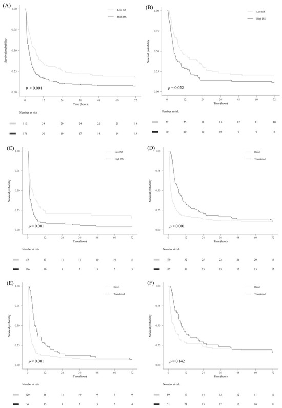 The survival probability of the high-ISS group (≥26) was significantly lower in all patients, as well as in the iTCA and oTCA subgroups. The transfer group showed a significantly higher survival probability than the direct group for all patients. This finding was consistent in the high-ISS subgroup; however, there was no statistically significant difference in survival in the low-ISS subgroup (Figure 3).