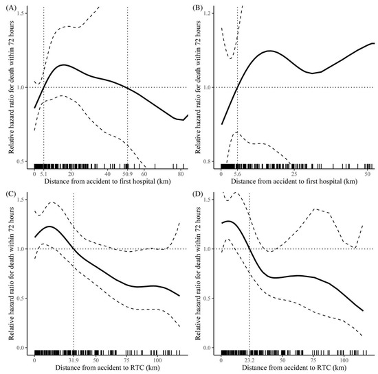 Restricted cubic spline curve analysis for relative hazard ratio for death within 72 h. (A) The distance from the accident site to the first hospital in all patients. (B) Distance from the accident site to the first hospital in the oTCA group. (C) Distance from the accident site to the RTC in all patients. (D) Distance from the accident site to the RTC in the oTCA group. oTCA, out-of-hospital traumatic cardiac arrest; RTC, regional trauma center.