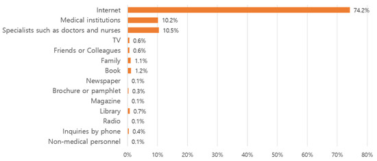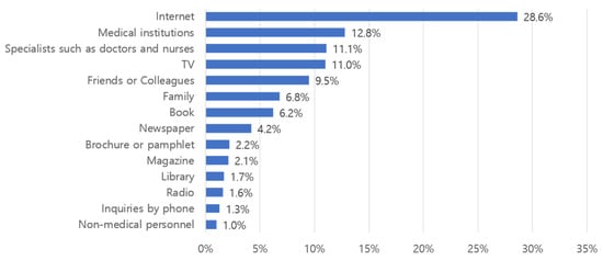 Participants were asked to answer a question with multiple responses about where they had found health- or disease-related information over the past year. The categories included books; brochures or pamphlets; magazines; newspapers; inquiries by phone; the Internet; medical institutions (hospitals, clinics, public health centers, etc.); libraries; family members; friends or colleagues; doctors, nurses, or healthcare providers (dentists, oriental doctors, pharmacists, etc.); non-medical persons (persons involved in complementary and alternative therapy [non-medical persons excluding acquaintances or medical personnel], etc.); TV; and radio. All measurements are included in Supplementary Table S3.