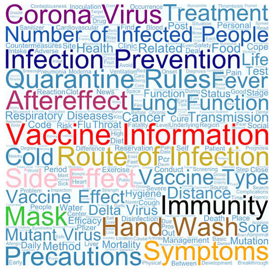 The most frequent search term in South Korea was “vaccines,” which was searched 277 times. Next, “vaccine side effects” were of particular interest and searched 84 times. Moreover, as the government’s distancing policy changed according to the aftermath of the COVID-19 pandemic based on the number of confirmed cases, route of infection, and changing quarantine rules, phrases such as “how to prevent COVID-19,” “wearing a mask,” and “washing hands” were ranked at the top among search terms. In contrast, in Germany, the most frequently searched terms for university students were “current spread of COVID-19” (89.6%), “restrictions” (85.9%), “current situation assessments and recommendations of confirmed cases” (77.8%), and “symptoms of COVID-19” (71.5%) [27]. The most retrieved information was on accessing medical treatment, managing self-quarantine, and offline and online support [2]. Thus, during the COVID-19 pandemic, the keywords in consumers’ searches for health information were influenced by the government’s quarantine policy in each country.