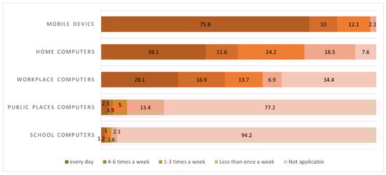 In this study, participants were asked how many times they had accessed the Internet per week on mobile devices (mobile phones, smartphones, or tablets), home computers (including laptops), work computers (including laptops), school computers (including laptops), and computers (including laptops) in public places (libraries, community offices, etc.). The response categories were every day, 4–6 times a week, 1–3 times a week, less than once a week, and not applicable.