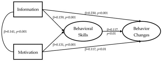 The results of analyzing the research model used in this study are presented in Figure 5 and Table 4. The research model’s overall fit was excellent, with χ2 = 41.814; df = 23; p = 0.010; TLI = 0.989; CFI = 0.993; and RMSEA = 0.028. In terms of the path coefficients between the major variables, the higher the value for information, the higher the values for behavioral skills (β = 0.159, p < 0.001) and behavioral changes (β = 0.230, p < 0.001). Behavioral skills (β = 0.131, p < 0.001) and behavioral changes (β = 0.117, p < 0.01) also increased. In addition, the higher the value for behavioral skills, the more significant the level of behavioral changes (β = 0.117, p < 0.01).