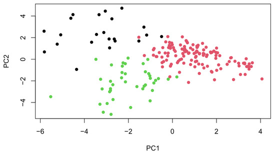 The between-cluster/total sum of squares ratio was 86.1%, indicating that 86.1% of the total variance in the data can be explained by the clustering. Therefore, the clusters were well defined (Figure 2).