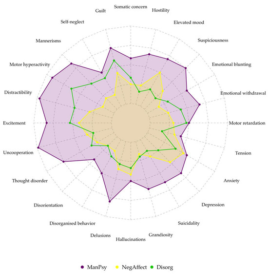 - Cluster 1 (ManPsy)—characterized by especially high scores of elevated mood (0.131), grandiosity (0.12), excitement (−0.29), distractibility (−0.23) and motor hyperactivity (−0.21). Hostility, disorganized behavior, lack of cooperation and delusions were also present to a smaller extent.