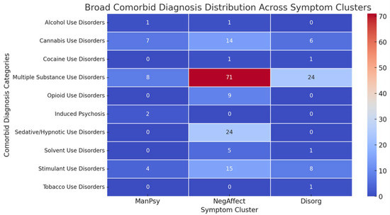 Based on the Brief Psychiatric Rating Scale results, three clusters of symptoms were found—one with manic and psychotic features, one with negative mood and the last with disorganized features. Cannabis use disorders showed strong associations with the ManPsy cluster. According to a systematic review, cannabis use is associated with an approximately threefold (OR: 2.97; 95%CI: 1.80–4.90) increased risk for the new onset of manic symptoms [18]. Opioid use disorder and multiple substance use disorder were associated with the NegAffect cluster. The latter was also the most common diagnosis. The clustering solution showed strong validity, with a high between-cluster variance ratio indicating well-separated groups. The three profiles mirror broader transdiagnostic dimensions, suggesting that substance-related presentations align with recognizable psychopathological structures rather than substance-specific syndromes. While this offers potential clinical utility in anticipating care needs, the relatively small sample size limits the generalizability of these clusters and warrants replication in larger cohorts.