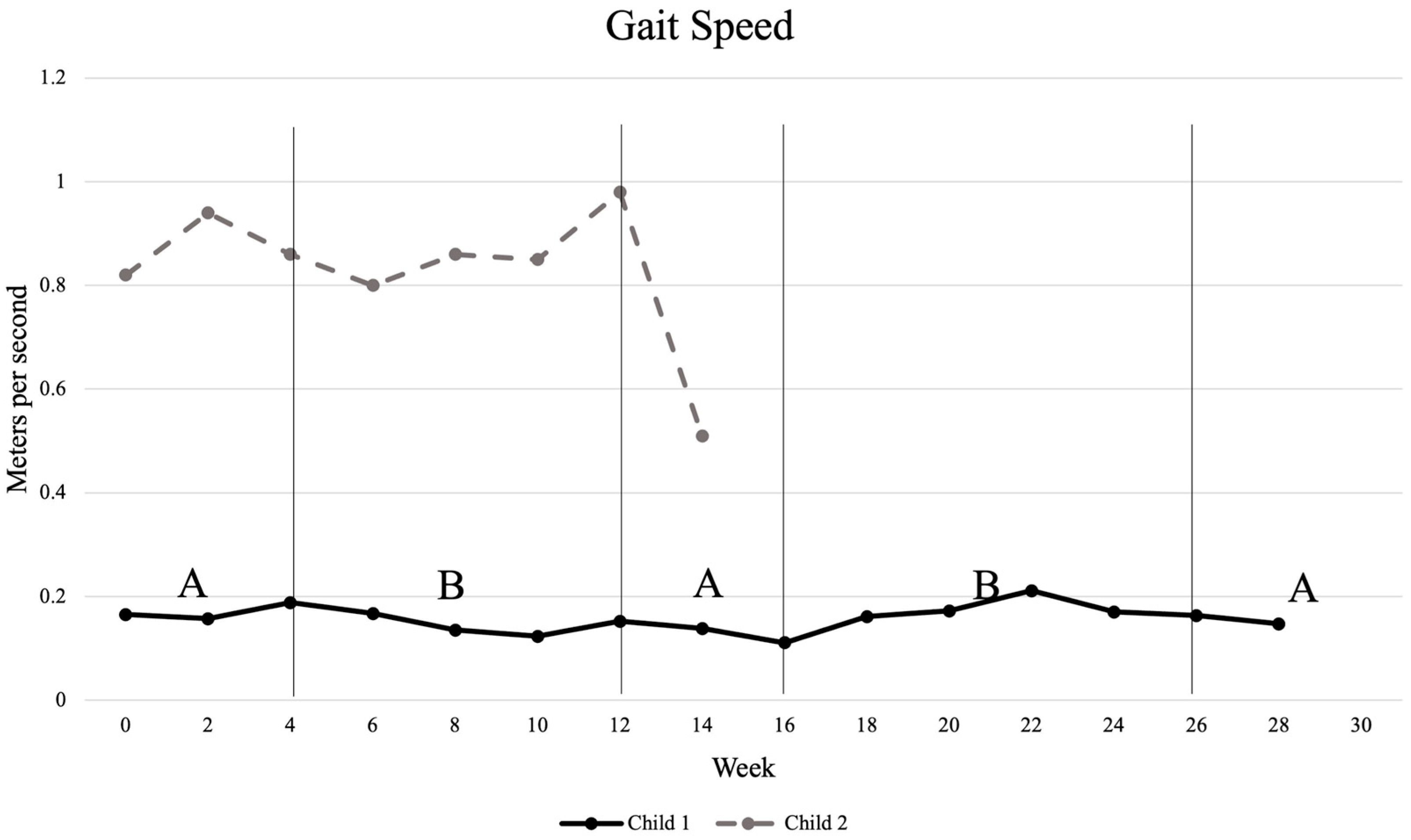42]. Findings from this single-subject design study suggest that the intervention may have had a positive short-term effect on gait speed in Child 2; however, the improvements were not sustained. There was, however, a rapid decrease in speed during the withdrawal phase that was clinically significant [