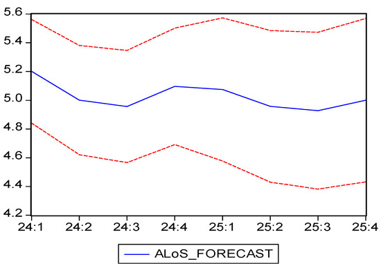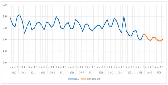 In the years that followed the end of the pandemic, our results showed a decline in the ALoS, which reached a low of 5.16 in 2023, a reduction that may reflect changes in medical protocols after COVID-19 or increased efficiency of the medical treatments. Out of several valid forecasting models, we chose ARIMA(4,1,1) as the most suitable for modeling the ALoS based on the minimum Akaike and Schwarz criteria values. This model has projected a continuous decline in the ALoS, which reached a minimum of 4.95 days in the third quarter of 2024, followed by a slight increase during the autumn and winter quarters. Regarding 2025, the ALOS is projected to fluctuate between 4.92 and 5.07 days, thus continuing the moderate downward trend compared to historical values.