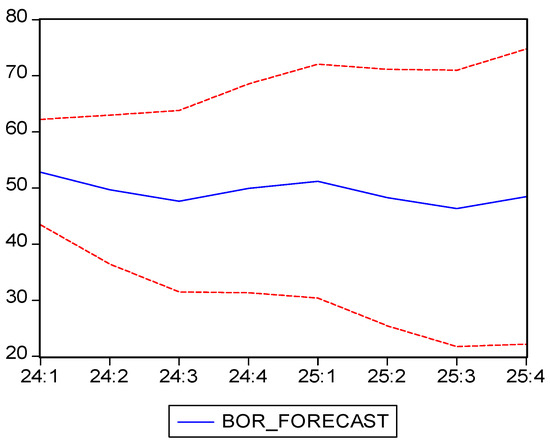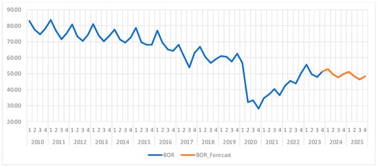 Figure 4. The ARIMA(2,1,2) model forecasts the evolution of the BOR for 2024 and 2025, showing a gradual decline in this indicator during the warmer periods (spring and summer), followed by a slight increase in autumn and winter. The same seasonal patterns are expected in 2025, with BOR varying between 46.35% in the third quarter and 51.22% in the first quarter.