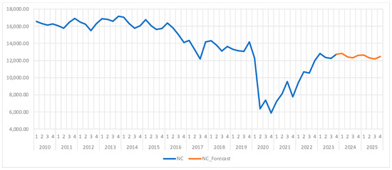 Our forecasting model predicted that the NC will stabilize in the following years, with moderate seasonal variations similar to those observed in the past. Moreover, the ARIMA model showed that the NC will range between 12,200 and 12,800 in 2024 and 2025, with slight increases in autumn and winter while maintaining stable post-pandemic trends. In addition, the ARIMA(2,1,2) model was able to effectively capture the seasonality and medium-term dynamics of this indicator, highlighting a steady recovery without fully returning to pre-pandemic levels. The application of first-order differencing allowed the data to be prepared for proper modeling and, thus, led to reliable forecasts for the next years.