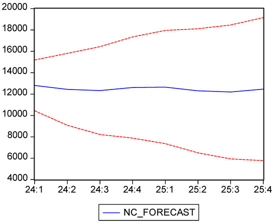 Using the correlogram of D(NC) we tested several potential ARIMA models, ARIMA(2,1,2) emerging as the most representative, according to the Akaike and Schwarz criteria. In the selected model, the estimated coefficients are statistically significant, with