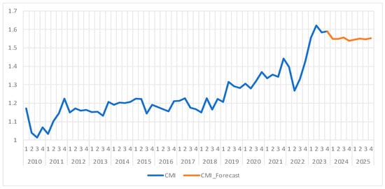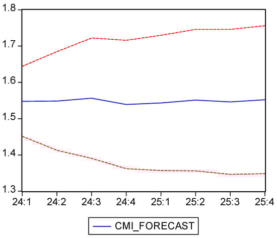 Figure 8. Similarly with the other indicators, the ARIMA(3,1,3) model generated stable and accurate forecasts for CMI, both for short- and medium-term projections. Even if the initial series was non-stationary, the data were validated for being used in the model after first-order differencing.