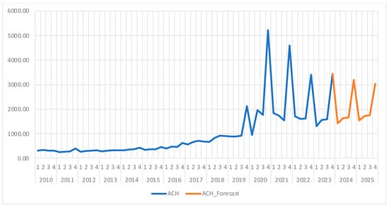 Figure 9 presents the evolution of the ACH between 2010 and 2023 and the forecasts for 2024 and 2025, showing a moderate upward trend until mid-2019, followed by significant fluctuations, especially in each year’s final quarter. These variations may be caused by the COVID-19 pandemic as well as additional end-of-year expenses.