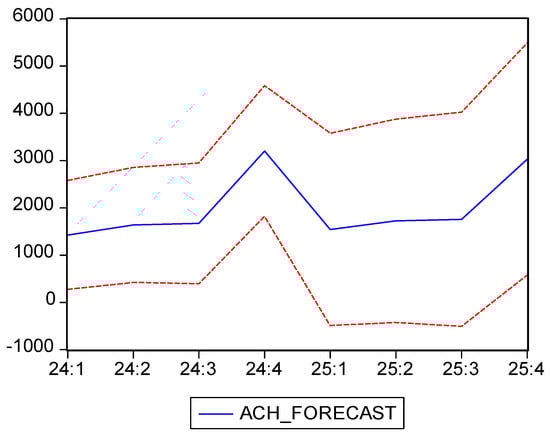 Using the correlogram of D(ACH) and testing several possible ARIMA(p,1,q) models, ARIMA(4,1,1) was selected as the most suitable for forecasting. This choice was based on the lowest Akaike and Schwarz criteria values among several valid models. The significant AR(4) coefficient indicates long-term autocorrelation, while the MA(1) coefficient captures short-term variations through a moving-average component.