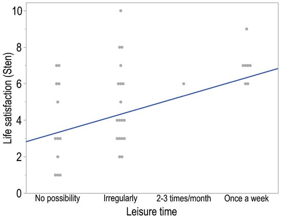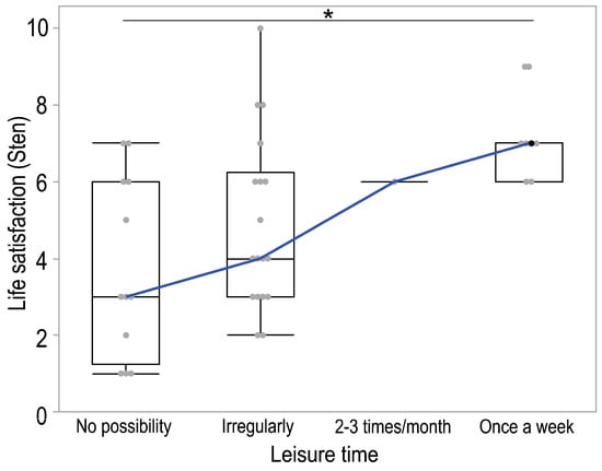 Moreover, noteworthy distinctions in the sten level, indicative of the level of life satisfaction, were observed among groups of parents based on their self-reported amount of free time (p = 0.017). In each instance, cumulative assessments of sentences were totaled, followed by applying a sten scale, with each result assigned a sten value according to established norms. The group lacking the opportunity for free time exhibited the lowest sten level, contrasting with the group reporting, on average, one instance of free time per week, which displayed the highest sten level (p = 0.018). No statistically significant differences were discerned among the remaining groups. The Jonckheere–Terpstra test also showed a significant ascending trend (p = 0.002) in the sten level according to leisure time (Figure 2).