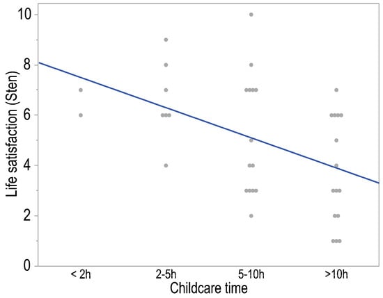 The survey study demonstrated a significant, moderate, and inversely proportional correlation between a parent’s level of life satisfaction and the amount of time devoted to childcare (p = 0.002; R = −0.48). The shorter the time spent on childcare, the higher the parent’s level of life satisfaction (Figure 3).