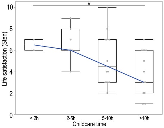 A statistically significant difference in sten scoring was also demonstrated between groups of parents who devoted time to childcare (p = 0.032). The highest sten values occurred in the group of people declaring less time spent on childcare (<2 h per day and 2–5 h per day), and the lowest in the case of spending more than 10 h a day on childcare. A post hoc Dunn’s test showed significant differences between parents declaring 2–5 h of childcare and the group spending more than 10 h on it (p = 0.049). A Jonckheere–Terpstra test also showed a significant, descending trend (p = 0.003) in sten level according to childcare time (Figure 4).