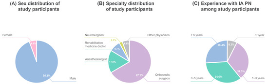 Characteristics of participants. (A): Sex distribution of study participants; (B): specialty distribution of study participants; (C): experience with IA PN among study participants. IA, intra-articular; PN, polynucleotide.