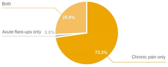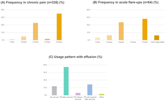 In terms of PN utilization in knee osteoarthritis, 73.3% (n = 176) of clinicians used PN only for treatment of chronic pain, 0.8% (n = 2) only for acute flare-ups, and 25.8% (n = 62) for both conditions (Figure 2). In cases of chronic pain (n = 238), the frequency of PN administration varied considerably. Specifically, 2.9% of clinicians administered PN once, 6.7% twice, 34.0% three times, 3.4% four times, and 52.9% five times (Figure 3A). Furthermore, clinicians (n = 64) used PN in acute flare-ups, with the majority administering PN three (34.4%) or five times (42.2%; Figure 3B). In the presence of effusion, the clinicians’ approaches were as follows: 17.4% of clinicians did not use PN, 55.5% removed the effusion before administering PN, 4.2% administered PN without removing the effusion, 20.4% removed the effusion and then waited before administering PN, and 2.6% had other approaches (Figure 3C).