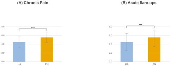 Comparative effectiveness of PN vs. HA by pain type. (A): Chronic pain; (B): acute flare-ups. PN, polynucleotide; HA, hyaluronic acid. p value: *** <0.001.