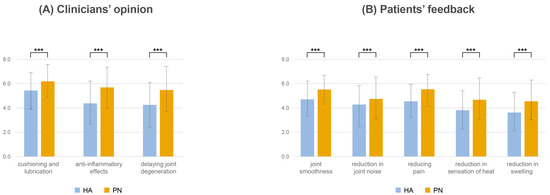We observed significantly higher mean efficacy scores for PN than IA HA for both chronic pain and acute flare-up (p < 0.001 for both). When evaluating the effectiveness of HA and PN, clinicians rated the buffering/lubricating effect, anti-inflammatory effect, and degeneration delay higher for PN than for HA. Patient feedback showed higher scores for PN in all categories, including joint lubrication, noise reduction, pain reduction, heat sensation reduction, and swelling reduction.