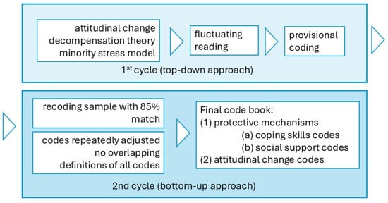 Second, repeated adjustments were made to make the codes more specific and avoid overlapping them. This second phase of coding consisted of an inductive approach [58]. During this phase, the operational definitions of all codes were created and organized within the dimensions according to Bardin’s exclusion criteria [56]. The dimensions are (1) protective mechanisms (from the minority stress model, with two categories: (a) coping skills and (b) social support) and (2) attitudinal changes (from the decompensation theory, contact hypothesis, parasocial contact hypothesis, and social stigma literature).