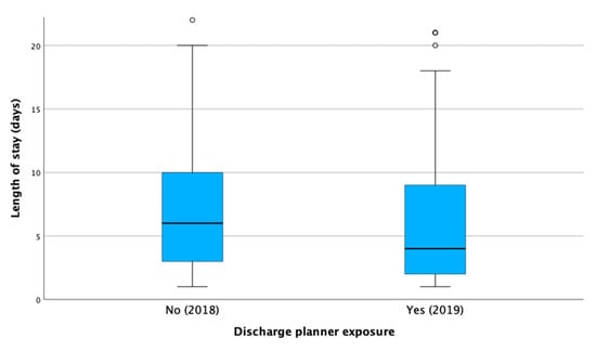 The multiple linear regression analysis was conducted to examine the association between the implementation of a discharge planning team and LOS while controlling for various patient characteristics and clinical factors. After adjusting for the other variables, the presence of a discharge planning team was not significantly associated with the LOS (β = −0.58, 95% CI [−2.78, 1.61], p = 0.60). However, several other factors were found to be significantly associated with the LOS. Patients admitted to the ICU (p < 0.0001) and those requiring intravenous antibiotics (p < 0.0001) had significantly longer hospital stays. The presence of certain comorbidities also contributed to an increased LOS, including liver cirrhosis (p = 0.03), and dysphagia (p = 0.02). In terms of functional status, each increase in the Barthel index was associated with a shorter LOS (p = 0.0045) (Table S2).