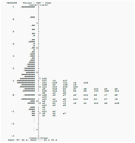 The unidimensionality was evaluated through an examination of the infit and outfit mean square statistics, point measure correlations, and PCA. For the infit and outfit mean square statistics, using a cutoff of 0.6 to 1.4, there were 11 items with infit statistics that were outside the recommended range (SA10, BER1, BER2, BER3, SC5, SC6, SC8, SC9, MP3, MP8, and MP17) and 9 items with outfit statistics that were outside the recommended range (LA11, SA10, BER1, BER2, BER3, SC6, SC8, MP8, and MP17) [40]. All point measure correlations were positive. For the PCA results, the criteria for unidimensionality were as follows: (i) the variance explained by measures of 40% or more; (ii) the variance explained by the first principal component of the residuals, which must be 15% or less; and (iii) the ratio of the variance in measures to the variance in the first principal component of the residuals, which must be 3:1 or more [43]. In the present case, the variance explained by the measures was 58.0%, and the variance explained by the first principal component of the residuals was 4.5%. The ratio of the variance in measures to the variance in the first principal component of the residuals was 12.89:1, fulfilling the criteria set out [43]. The mean infit mean square was 1.06 (sd: −0.23), and the mean outfit fit mean square was 1.05 (sd: −0.25). The person reliability was 0.97, and the person separation was 6.03. The item reliability was 0.99, and the item separation was 12.92. The item map indicated that the items were concentrated on the lower end and that there were not enough items targeting children with higher abilities (see Figure 1).