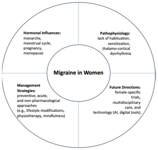 Migraines disproportionately affect women, particularly during their reproductive years, due to the complex interplay of hormonal, neurological, and lifestyle factors. Effective management requires a personalized approach which considers the unique needs of female patients across different life stages. Despite advances in both pharmacological and non-pharmacological treatments, there remain significant gaps in the research, particularly regarding the impact of hormonal changes and the need for tailored therapies during pregnancy and menopause. Future efforts should focus on expanding female-specific clinical trials, leveraging technological innovations, and enhancing education and awareness to improve diagnosis, treatment, and the overall quality of life for women with migraines (Figure 1).