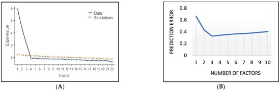 Closely observing Figure 1A,B provides information about the number of factors to retain for the A-MBI-MR. First, the number of factors associated with eigenvalues greater than 1 is three (see Figure 1A). Secondly, the parallel analysis [58] outcome from Figure 1A revealed that the point where the simulation data becomes greater than the observed data happens after the third factor. Further analysis using the out-of-sample prediction error reveals that after the prediction errors decrease to the third factor and start increasing again, suggesting that three factors are appropriate (see Figure 1B).