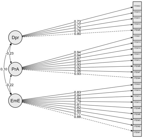 The final CFA model for the three-factor A-MBI-MR. Model indicators: Χ2 (206) = 545.770, p < 0.001, log-likelihood = −9626.129, CFI = 0.945, TLI = 0.938, GFI = 0.951, RMSEA = 0.074 RMSEA CI (0.066, 0.081), RMSEA p-value = 0.000, SRMR = 0.044. Average variance extracted: emotional exhaustion (EmE) = 0.668; personal accomplishment (PrA) = 0.859; depersonalization (Dpr) = 0.589.