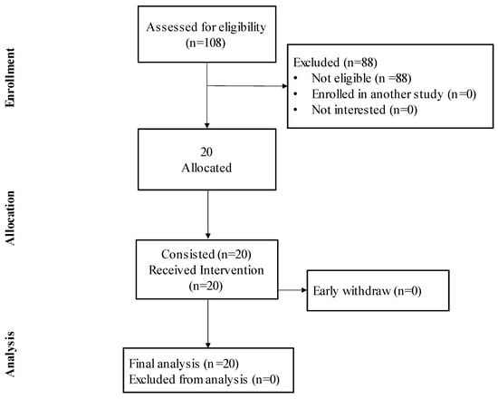 Twenty (N = 20) healthy participants (aged 25.5 ± 12.0 years; 6F/14M) fulfilled the inclusion criteria and participated in this study (Figure 1). The inclusion criteria included subjects of both sexes, aged >18 years, and with scores of ≥16 on the Athens Insomnia Scale (AIS-8). The exclusion criteria included a history of mental illness, dermatological diseases, allergies to massage oil, and any acute or chronic condition that would limit the ability of the patient to participate or consent to this study.