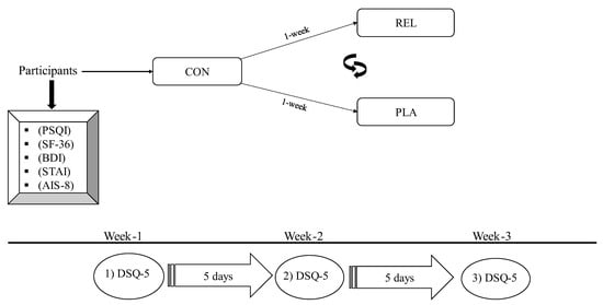 Study flow chart. Subjects were assigned in random orders to each of the two massage sessions. Note: (CON) control protocol; (REL) relaxation massage protocol; (PLA) placebo/sham massage protocol; (PSQI) Pittsburgh Sleep Quality Index; (BDI) Beck’s Depression Inventory; (STAI) State–Trait Anxiety Inventory; (DSQ-5) Daily Sleep Questionnaire–5 Days; (AIS-8) Athens Insomnia Scale. The order of either the REL or PLA allocation was random. The CON was always performed first as a baseline polysomnographic assessment.
