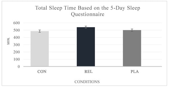 Additionally, the 5-Day Sleep Questionnaire (sleep diary) analysis revealed a statistically significant difference in total sleep time across the three sessions (CON, REL, and PLA) (F(2, 32) = 8.083; p = 0.002), with the REL condition being the most effective. Specifically, participants in the CON condition recorded a total of 486.2 min ± 1.26 of sleep over the 5-day period, followed by participants in the REL condition, who exhibited the highest total sleep time, with 539.75 min ± 1.41. Participants in the PLA condition had a total of 499.8 min ± 1.45 of sleep over the same period (Figure 3).