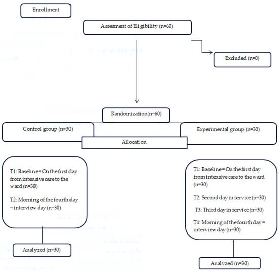 The study population consisted of patients who underwent open heart surgery between October 2023 and February 2024 in the cardiovascular surgery service of the Van Training and Research Hospital. Before collecting data for this study, the “G. Power-3.1.9.2” program calculated the sample size at an 80% confidence level. The “sample calculation formula with known universe (population volume)” (n = Nz2pq/d2 (N − 1) + z2pq) determined the sample. The literature review determined the “effect size” value to be 0.096. Taking a primary type error of 5% (Z = 1.96), a test power of 80%, and an effect size of 0.096 units, we calculated the minimum sample size as n = 60. Therefore, the study included 60 volunteer patients, with 30 placed in the experimental group and 30 in the control group [28,29,30].