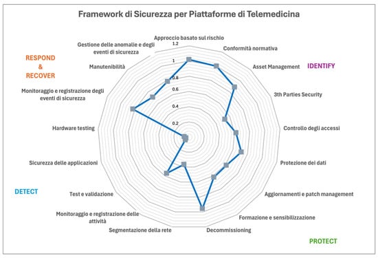 In particular, it can be inferred that our index allows us to have, in a single value, both the overall risk index (CRP) and to reconstruct a radar plot that allows us to evaluate the different indices for each category. Notice that CRP is useful to assess the overall cyber posture of a telemedicine platform, but it does not provide useful inputs on how to improve the posture. More information can be achieved by using, as illustrated in Figure 2, a radar plot, which allows us to emphasize which controls to improve.