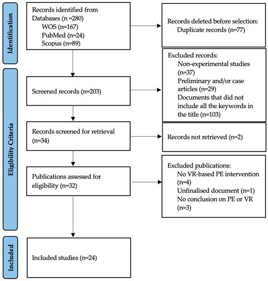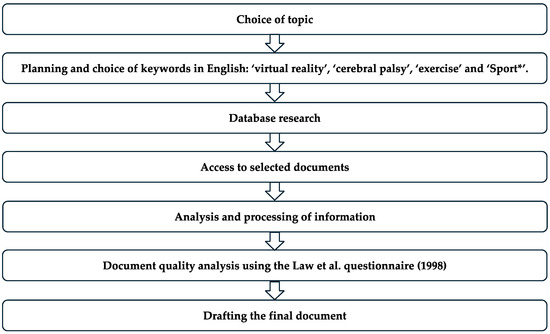 The search process was conducted in August 2024. The platforms used were Web of Science (WoS), Scopus (Elsevier), and PubMed (NIH). The search was performed in English, employing the following final search phrase (“virtual reality” AND “cerebral palsy” AND (“exercise” OR “sport*”)) in the same way across all databases, refining results by language (English and Spanish) and document type (Article).