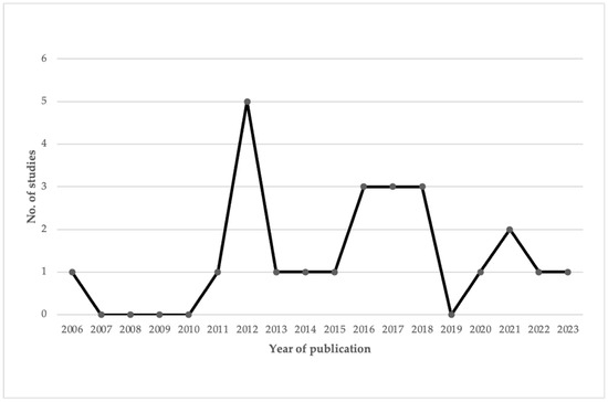 Based on the publication years, the first experimental study was published in 2006, followed by a period of inactivity until 2011. From this year onward, except for 2019, studies were continuously published until 2023, with 2012 being the year with the highest number of studies, totaling five. Regarding the methodological quality of the studies, 21 of them received an A rating, and 3 received a B rating. The criteria most often unmet were criterion 5 (justification of the number of subjects) and criterion 13 (specification of the number of study dropouts).