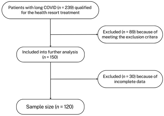 After considering the exclusion criteria, 150 medical histories were included in the next stage of review. Due to incomplete data, 30 medical records of patients undergoing health resort treatment were excluded. In the final stage, medical records of 120 patients were analyzed (Figure 1).