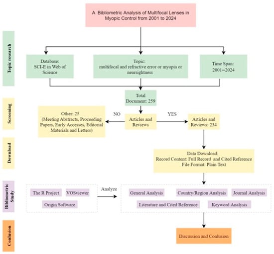 The terms, “multifocal” and “refractive error or myopia or nearsightedness” were used as topics, excluding the topics “intraocular”, ”electroretinogram”,” choroidal neovascularization” and “VEP” in the Web of Science core collection databases, between 1 January 2001 and 26 October 2024, with no language restriction. The literature search was concluded on 26 October 2024. The methodical process of the scientometric research is shown in Figure 1. The articles and reviews were refined and used for scientometric analysis.
