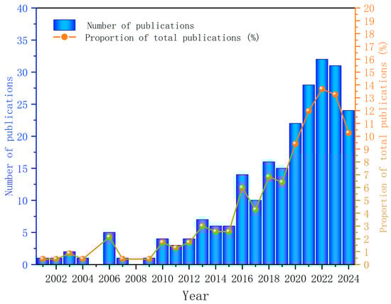 The raw data from the literature search were systematically analyzed using the Bibliometrix package (Version 4.3.0, Aria, M., & Cuccurullo, C., 1 July 2024) within the R programming environment (Version 4.2.2, R Core Team, 2022). Primary information, including the annual publication counts, geographical distribution of contributing countries or regions, associated journals, prevalent keywords, and titles of the literature, were extracted using Bibliometrix. VOSviewer (Version 1.6.19, Leiden University, Leiden, The Netherlands) was used to optimize and supplement the analytical process, particularly in refining the graphical representations of the data. Visualization of the extracted information was performed using a combination of tools, including the R software (Version 4.4.2) for dynamic data manipulation and Origin software (Version 2022, OriginLab Corporation, Northampton, MA, USA) for its sophisticated graphing capabilities and for creating interactive and publication-quality figures.