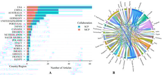 (A) Number of publications by country or region. SCP, single-country publication, a publication in which all authors are from the same country; MCP, multiple-country publication, a publication with authors from multiple countries, known as a joint publication. (B) The cooperative relationships between a country or region, where the wider the band, the stronger the cooperation between the two regions.