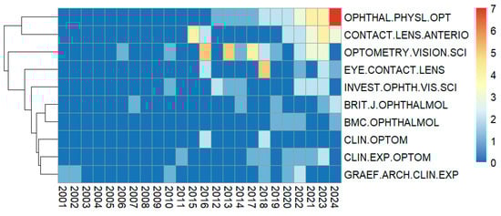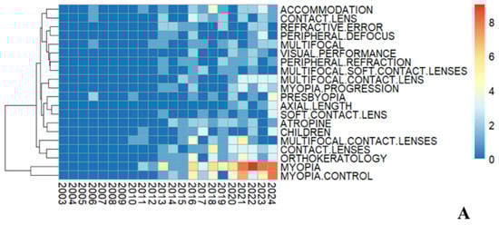 According to the principles of bibliometrics, keywords represent the focal points and prevailing trends within a given research field []. In this analysis, the visualization of keywords is depicted through a heatmap (Figure 5A) and a co-occurrence network diagram (Figure 5B). As shown in Figure 5A, the heatmap illustrates an increase in keyword frequency by the year, with “myopia” emerging as the most prominent topic, followed by other significant keywords such as “myopia control”, “orthokeratology”, “contact lenses”, and “multifocal contact lenses”.