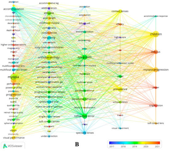 A co-occurrence network presents a more nuanced perspective by grouping keywords into distinct clusters, color-coded according to their correlations. As observed in Figure 5B, the keyword “myopia” appeared as the largest node within the network, aligning with the central research topic of this study.