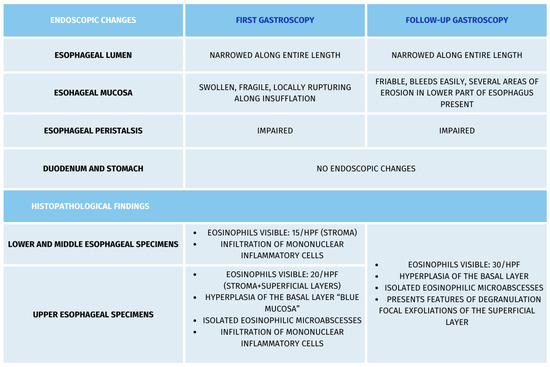 The results of the histopathology examinations were summarized as follows: all esophageal specimens presenting with mucosal fragments, covered by multilayered squamous epithelium, with focal exfoliations of the superficial layer, hyperplasia of the basal layer, epithelial foci of up to 30 eosinophils/HPF, some of them with features of degranulation, isolated eosinophilic microabscesses. Sections from the stomach and duodenum presented with unremarkable mucosal membranes (Figure 2).