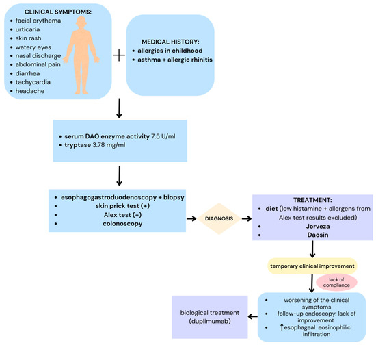 As the clinical and histopathological presentation of eosinophilic esophagitis worsened, the patient was referred to another clinical center to be qualified for biological treatment (Dupilumab). DAO enzyme supplementation and the existing treatment were maintained (Figure 3).