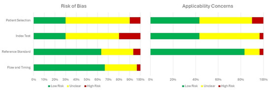 The risk of bias assessment using the QUADAS-2 tool is presented in Figure 2 (per-study evaluation) and Figure 3 (summary of domains). Detailed per-study justifications are provided in Supplementary Table S2. Most studies were rated as low risk for the reference standard domain, while concerns regarding patient selection and index test applicability were more frequent.